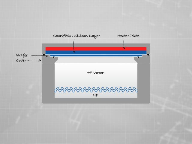 Hydrofluoric acid (HF) is an ideal etchant for all silicon oxide types used in micromachining, since it allows fast etch rates and is highly selective against silicon. A typical application for HF etching is the removal of sacrificial oxide layers in MEMS fabrication. However, as is typical for liquid-phase etchants, there is a high risk of the movable structure sticking to the substrate due to the effects of surface tension.